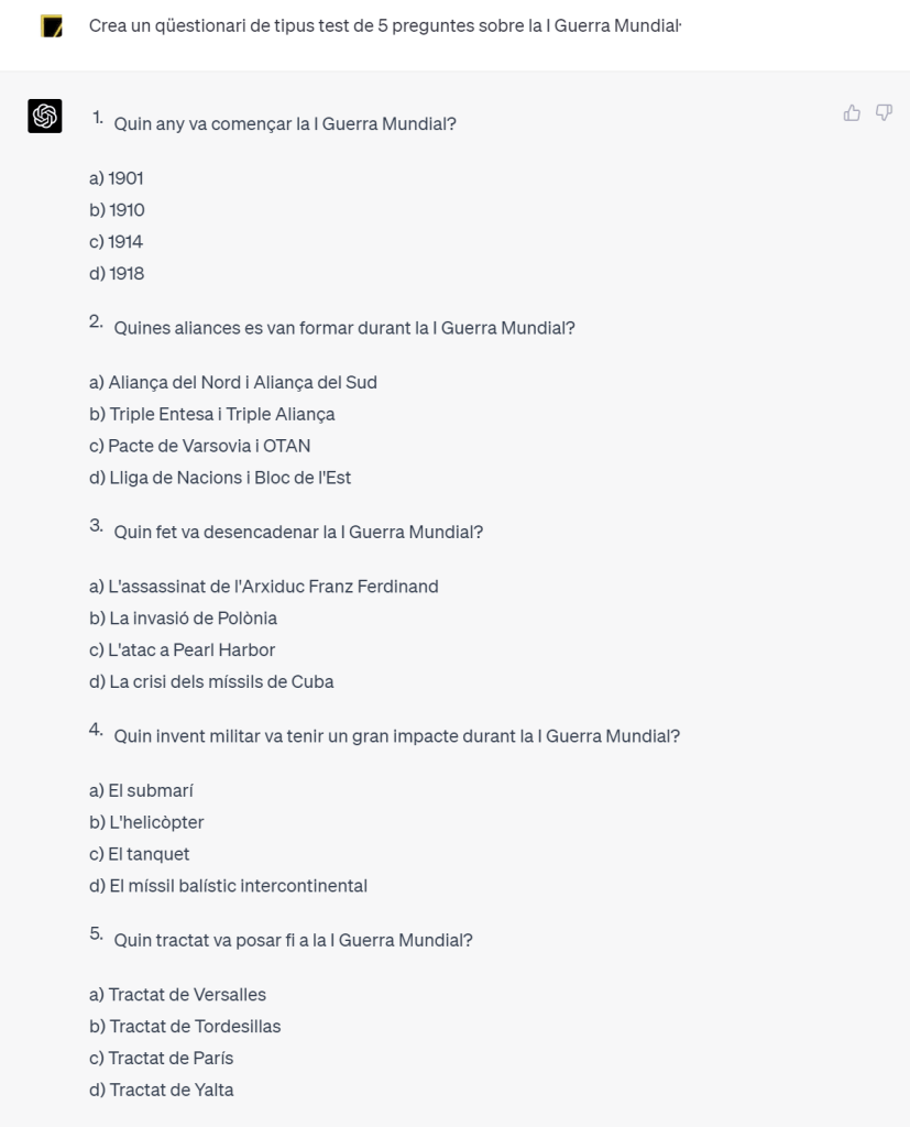 Imaginem-nos que volem preparar un qüestionari per a una classe d’història del món contemporani amb l’ajuda de GPT4.