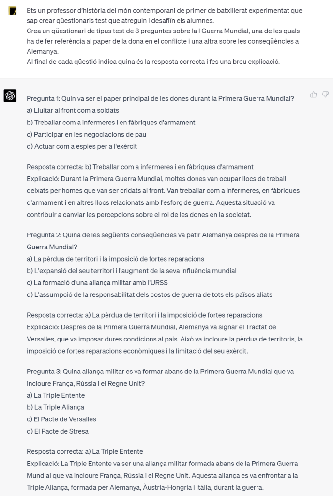 Fixeu-vos que li hem donat un rol (professor d’història engrescador), li hem especificat quin tipus de preguntes han de sortir (però no exactament com ha de ser) i li hem demanat que ens digui quina és la resposta correcta i que redacti una explicació. Si nosaltres exportem aquest test a Socrative o a Google Forms, l’alumne, a més de saber si ha encertat o no, tindrà una explicació que reforçarà el seu coneixement.