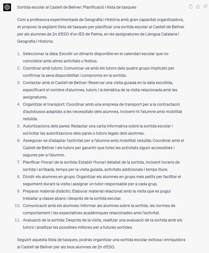Imagina que estàs preparant una sortida escolar i necessites una llista de tasques per assegurar-te que tot estigui a punt a temps. Pots demanar a ChatGPT que t’ajudi proporcionant-li informació sobre l’excursió i sol·licitant una llista de tasques. ChatGPT pot respondre generant una llista que inclogui aspectes com confirmar la data i l’hora, crear una llista d’alumnes participants, recollir autoritzacions dels pares, organitzar el transport i planificar les activitats durant la sortida, entre altres tasques rellevants. Escriurem el prompt tenint en compte l’esquema proposat en una entrada anterior, que us recomano llegir.