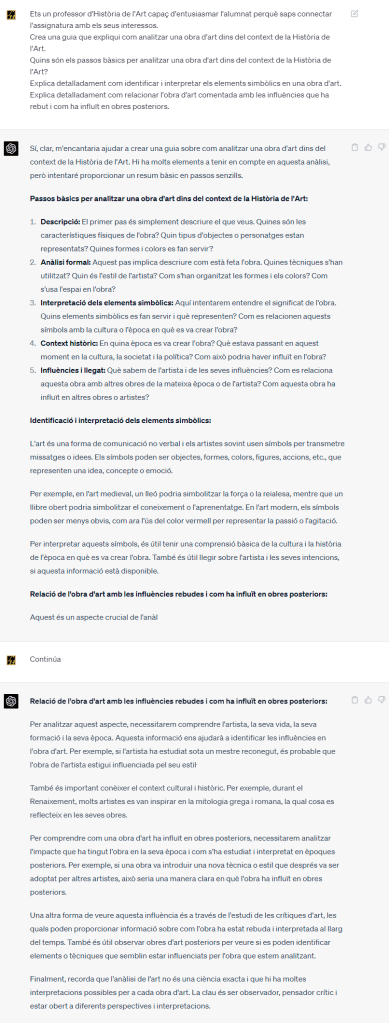 Un cop tenim la llista de passos, podem demanar a ChatGPT que ens doni més detalls sobre cada pas. Per exemple, podríem demanar: “Explica més detalladament com identificar i interpretar els elements simbòlics en una obra d’art.”