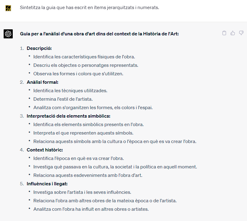 ChatGPT és útil per desglossar tasques complexes en passos més petits i manejables. Després de definir la tasca, podem demanar-li que la divideixi en etapes bàsiques. Per exemple: “Quins són els passos bàsics per analitzar una obra d’art dins del context de la Història de l’Art?”