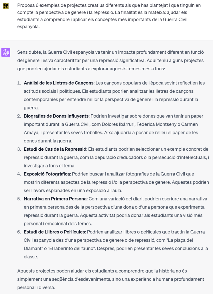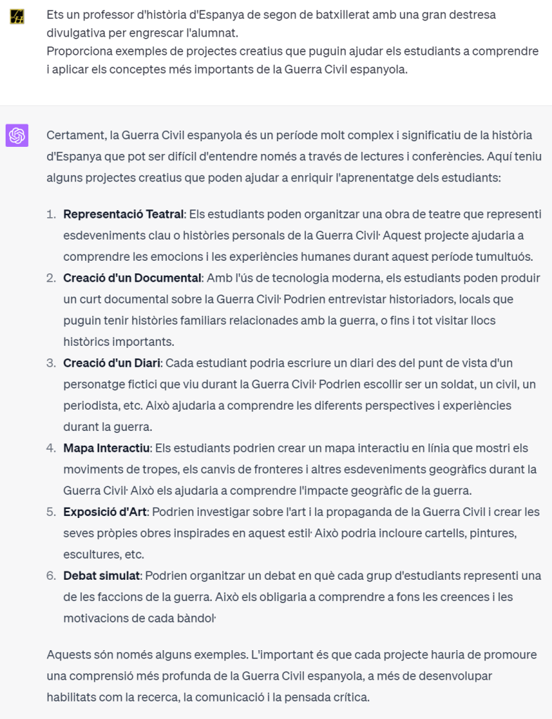 Per arribar a detallar una activitat que ens agradi s’ha de fer quelcom més que fer una pregunta i pitjar un botonet. Hem d’anar del més general al més concret, i la primera passa pot ser demanar a ChatGPT que ens proposi un grapat de projectes creatius per a què el nostre alumnat aprengui d’una forma activa… la Guerra Civil espanyola.