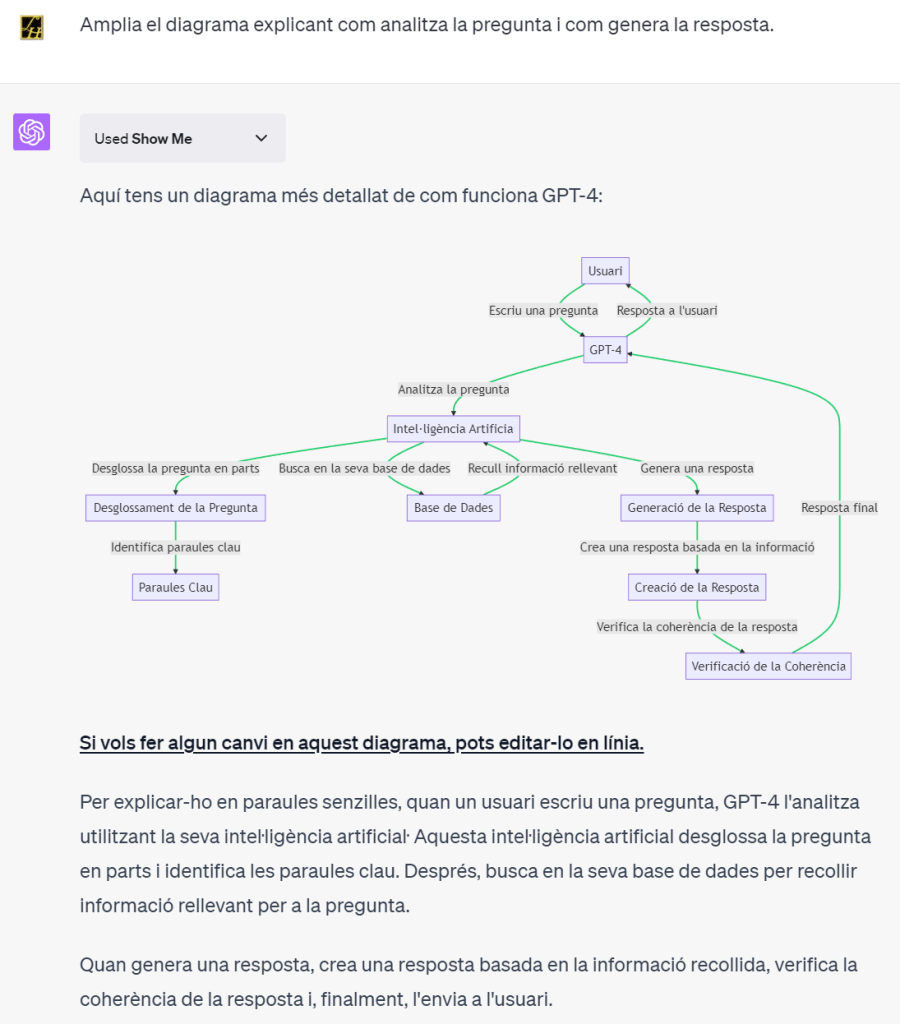 GPT-4 permet enriquir molt l’experiència del seu ús mitjançant la instal·lació i activació de connectors (plugins). Fa poc vérem en funcionament AskYourPDF. Avui toca un altre: Show Me, que ens permet fer diagrames amb ChatGPT.