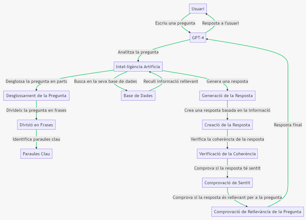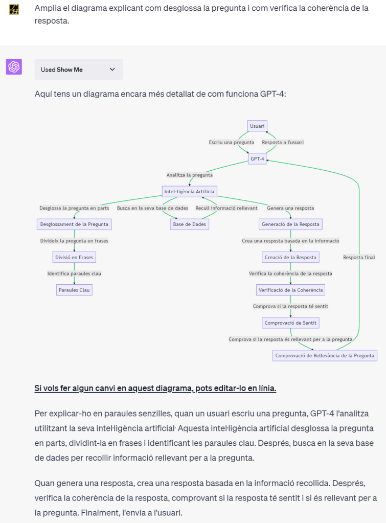 Com que sempre és millor un exemple, encara que sigui senzill, que xerrameca teòrica, veurem la utilitat d’aquest connector amb un cas pràctic. Provarem de que GPT-4 faci un diagrama sobre el seu propi funcionament: