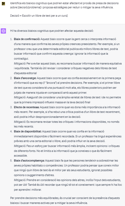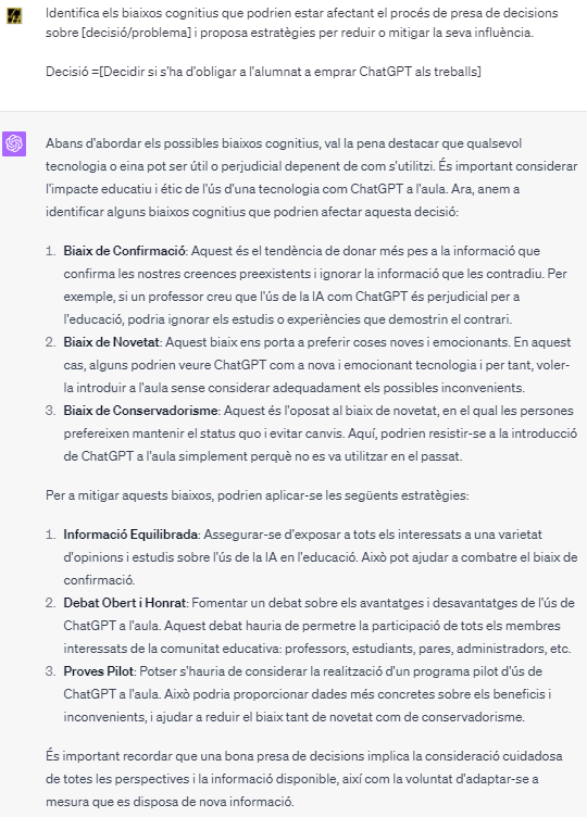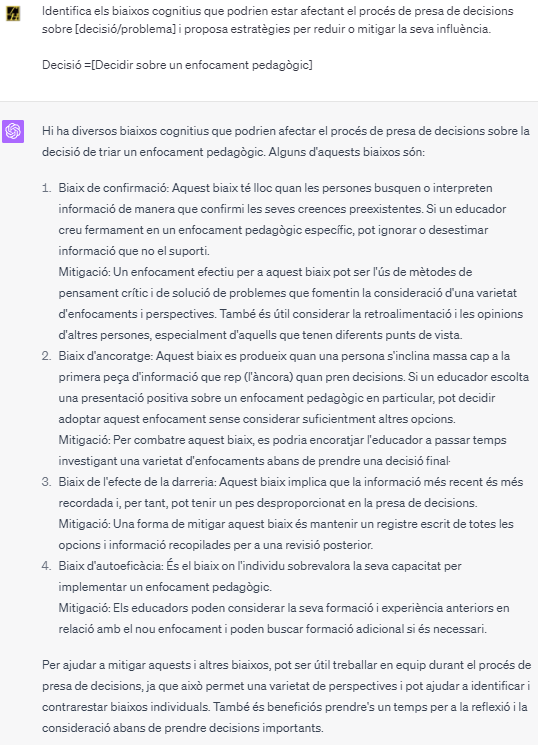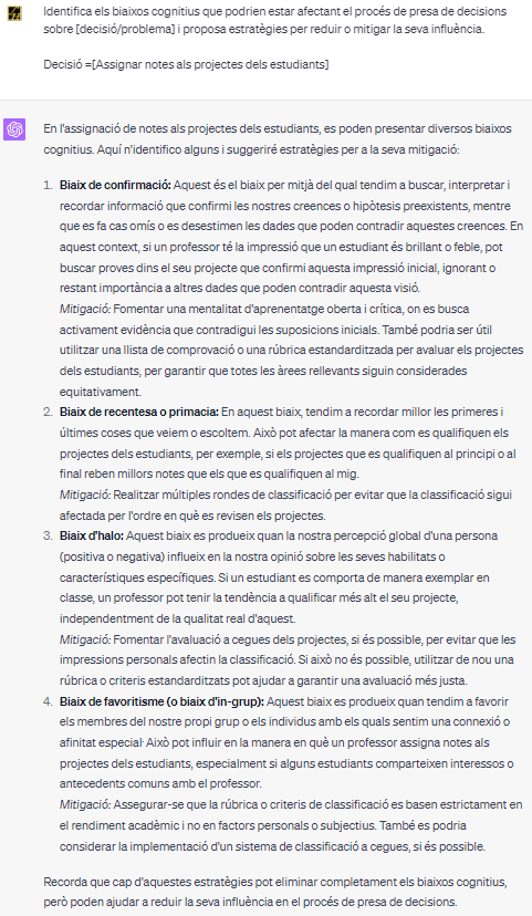 Una manera en què la IA pot ser d’ajuda en aquest àmbit és a través de l’ús de ‘prompts’ o indicacions per a la presa de decisions. Un prompt, per exemple, podria ser: “Identifica els biaixos cognitius que podrien estar afectant el procés de presa de decisions sobre [decisió/problema] i proposa estratègies per reduir o mitigar la seva influència”. Aquesta senzilla frase pot ser aplicada a una gran varietat de situacions, des de la distribució dels estudiants en grups de classe, a l’elecció de llibres de text, a l’assignació de notes, a l’elecció de mètodes d’ensenyament o a la decisió d’implementar noves tecnologies.