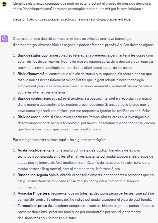 En considerar si s’hauria d’implementar una nova tecnologia d’aprenentatge, un professor pot estar afectat per biaixos com el biaix de l’efecte IKEA (valorar més altament les coses que ha invertit temps a construir) o el biaix de resistència al canvi (preferir mantenir les coses com estan per evitar l’esforç de canvi). Aquest prompt pot ajudar al professor a identificar aquests biaixos i a desenvolupar estratègies per a superar-los, com ara provar la nova tecnologia en una escala més petita abans de decidir si implementar-la a tota l’aula.