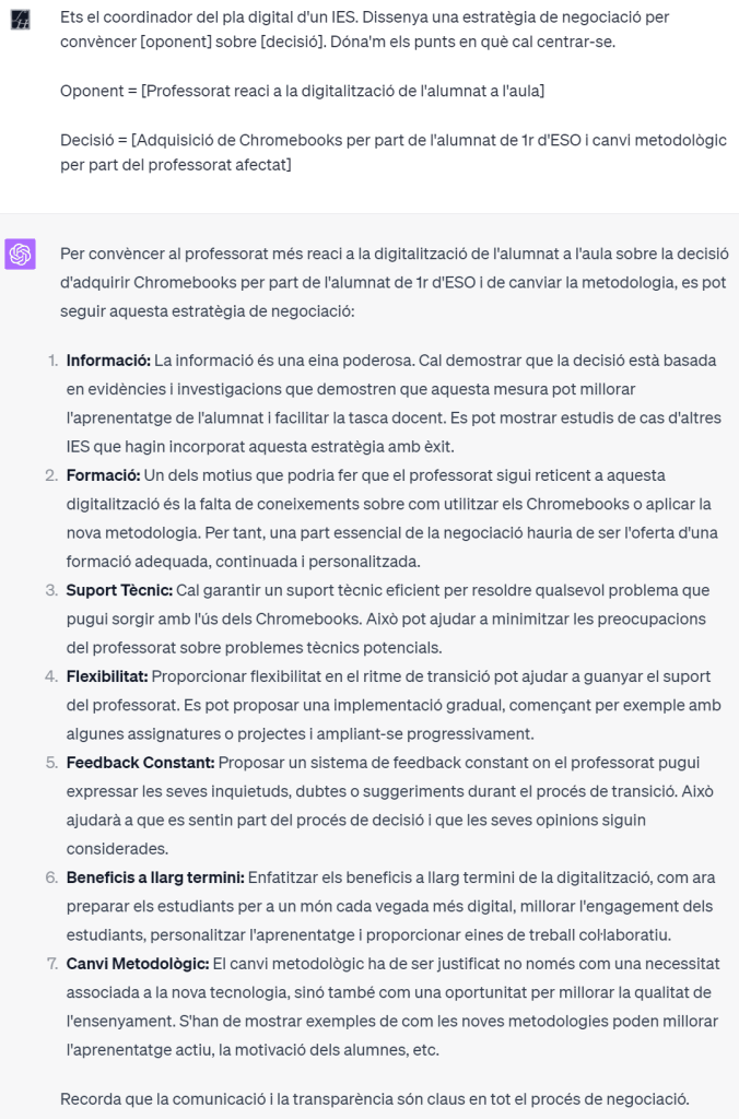 Tot d’una aprendrem com utilitzar ChatGPT per negociar amb èxit amb membres reticents al canvi de la comunitat educativa. Amb el prompt adequat, ChatGPT ens presentarà l’enfocament que heu de prendre, destacant els punts clau en què us heu de centrar.
