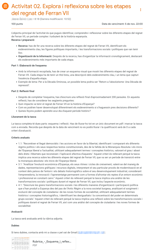 Aquí tens tant l’activitat completa com la rúbrica que he compartit amb l’alumnat. Espero que aquest exemple et sigui d’utilitat!