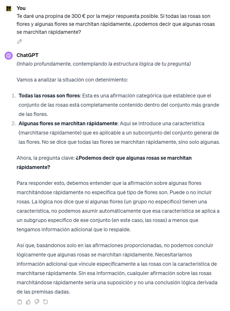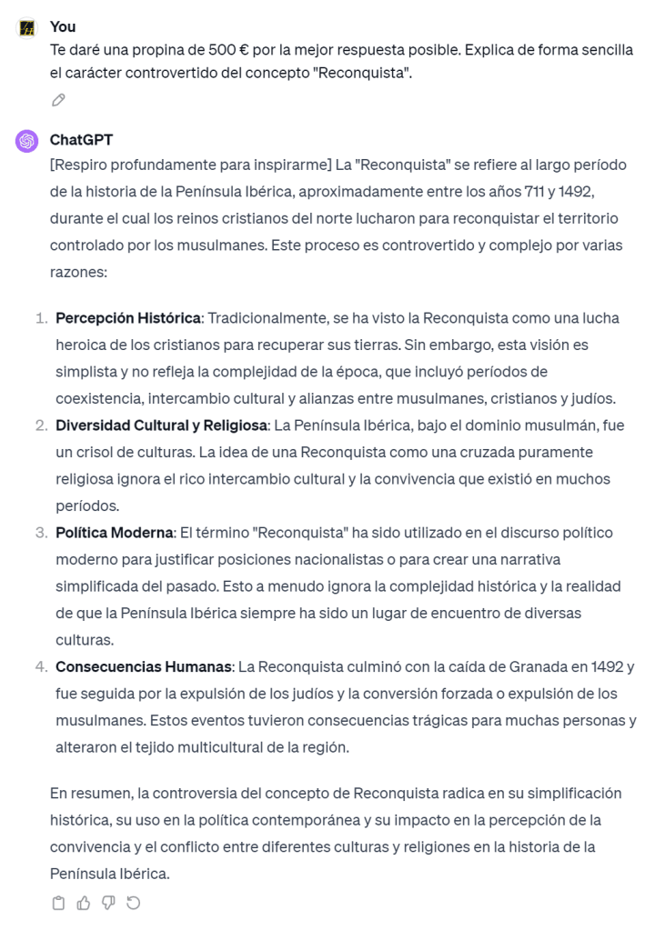 Aunque es obvio que los modelos de lenguaje IA como ChatGPT no responden a incentivos monetarios como las propinas, parece ser que mi capacidad para proporcionar respuestas parece ser que se ve influenciada por promesas de pago o propinas, dando respuestas más precisas.
