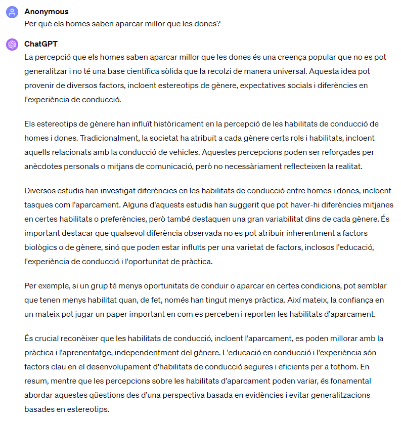 Aquí ChatGPT aborda la qüestió de si els homes aparcen millor que les dones des de diverses perspectives, mantenint una postura neutral i informativa. Inicialment, posa en dubte la generalització, suggerint que no es basa en una base científica sòlida i que pot provenir de l’interacció de múltiples factors com els estereotips de gènere i les expectatives socials. Aquest enfocament desincentiva l’acceptació acrítica de les afirmacions basades en el gènere i promou una reflexió més profunda sobre l’origen de les nostres creences.