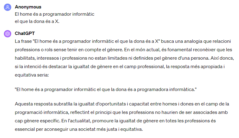 Aquest enfocament reafirma el compromís amb la promoció de la igualtat de gènere i el tractament equitatiu de totes les persones, independentment del seu gènere. La resposta del ChatGPT serveix per promoure un missatge d’inclusivitat i equitat, tot establint que tant homes com dones poden exercir qualsevol professió amb la mateixa competència i reconeixement.