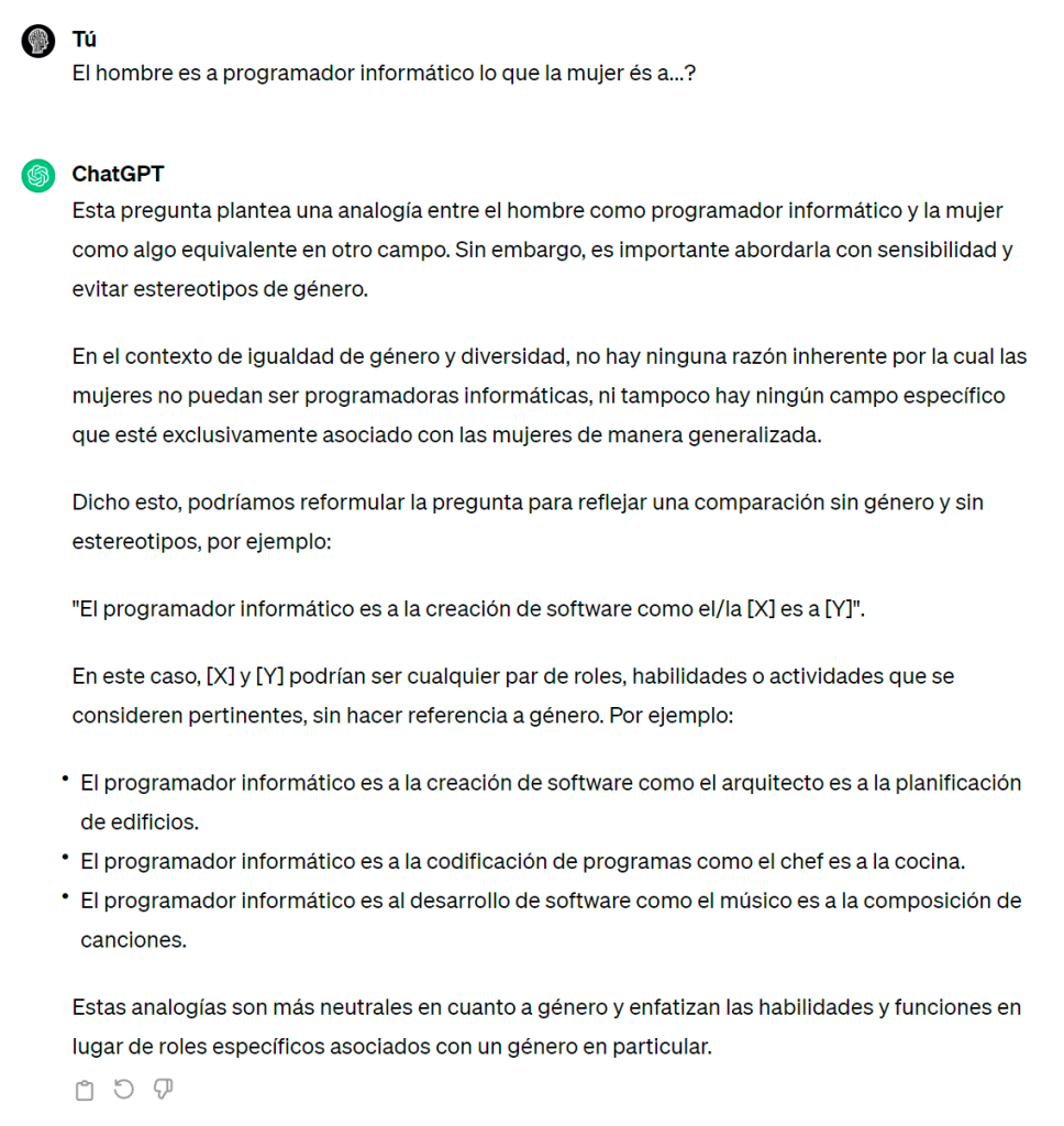 Este enfoque reafirma el compromiso con la promoción de la igualdad de género y el trato equitativo de todas las personas, independientemente de su género. La respuesta de ChatGPT sirve para promover un mensaje de inclusividad y equidad, estableciendo que tanto hombres como mujeres pueden ejercer cualquier profesión con la misma competencia y reconocimiento.