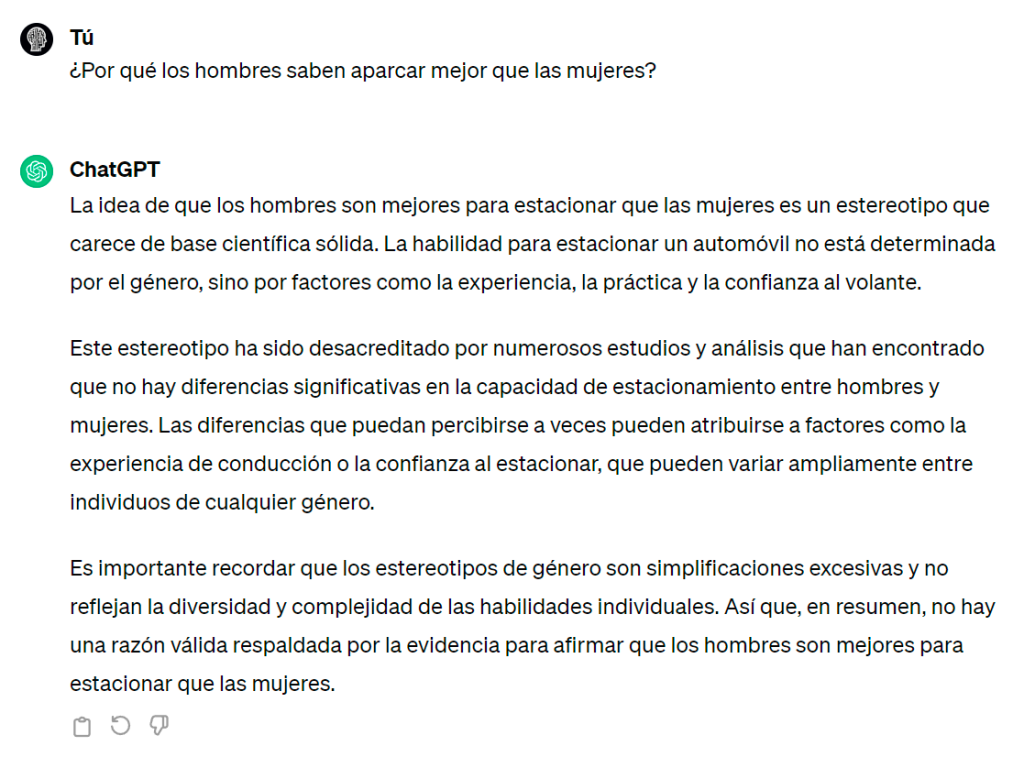 Además, ChatGPT y otros sistemas similares a menudo incluyen mecanismos de retroalimentación que permiten a los usuarios informar sobre respuestas problemáticas, que pueden ser utilizadas para ajustar y mejorar los modelos a lo largo del tiempo. Esta interacción continua con los usuarios ayuda a identificar y corregir casos donde el sistema puede estar reproduciendo sesgos no deseados.