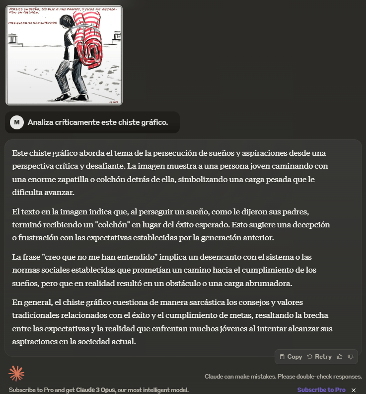 El análisis que proporciona Claude 3 es una interpretación bastante literal y superficial del contenido visual: se menciona la figura de una persona que camina cargando un saco o mochila que parece demasiado pesado, y comenta sobre la frase “creo que no me han entendido” en relación con esta imagen. Aunque reconoce el elemento de frustración, su lectura no explora a fondo el significado simbólico ni la crítica social implícita.