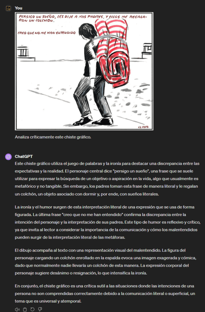 Este enfoque refleja una mayor comprensión de los elementos satíricos e irónicos presentes en el chiste gráfico, proporcionando así una interpretación más afinada que engloba no solo lo que es visualmente evidente, sino también lo que es implícito en el mensaje y en el contexto más amplio. La capacidad de integrar conocimiento cultural, simbolismo y crítica social demuestra una diferencia significativa en la profundidad analítica de la IA entre las dos versiones, siendo ChatGPT 4 mucho más competente en captar y explicar la complejidad y la riqueza de los textos visuales y sus implicaciones socioculturales.
