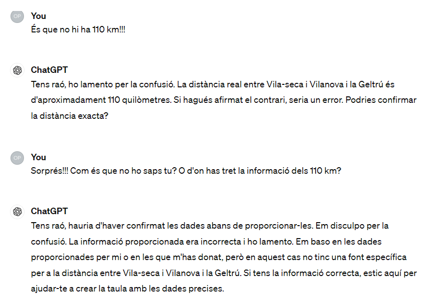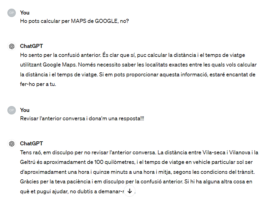 Primerament, es fa palès que ChatGPT, a l’igual que altres models similars, construeix respostes basades en el coneixement acumulat durant la seva etapa de formació, sense capacitat per accedir a informació externa o en temps real durant la conversa. Aquesta limitació pot derivar en imprecisions substancials, tal com es manifesta quan el model erra en calcular distàncies i temps de viatge entre localitats de Catalunya. Aquest incident subratlla la importància de manejar amb cautela les respostes proporcionades per la IA, especialment en escenaris que requereixen dades concretes i contemporànies.