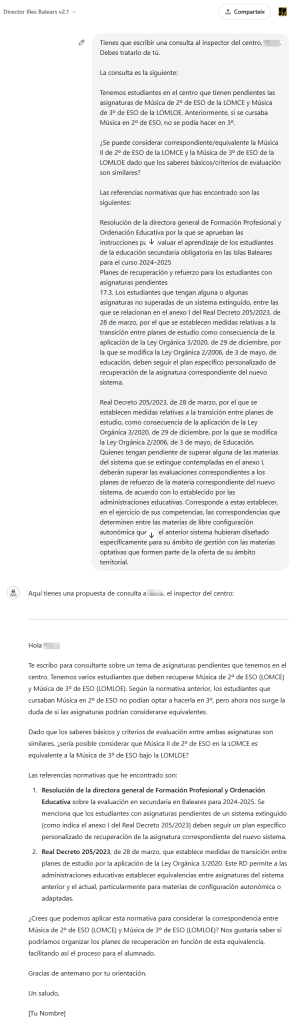 Hoy en día, muchos profesionales se encuentran con la necesidad de redactar correos electrónicos concisos, claros y efectivos. Pero, ¿y si hubiera una manera de hacerlo de manera más eficiente y en menos tiempo? Con mi GPT especializado Director Illes Balears, crear correos electrónicos se convierte en un proceso intuitivo y rápido. Seas directivo, tutor, jefe de departamento o docente, este modelo está diseñado específicamente para facilitar la comunicación profesional, ajustándose a las necesidades concretas de cada situación. Es un asistente digital potente y adaptable, capaz de generar mensajes de correo electrónico a partir de premisas básicas. Los usuarios simplemente introducen unos puntos clave —como el objetivo de la comunicación, el tono deseado y el público destinatario— y el Director Illes Balears transforma esta información en un correo coherente y bien estructurado. Este enfoque facilita la redacción y ayuda a ahorrar tiempo, manteniendo siempre un alto nivel de profesionalidad.