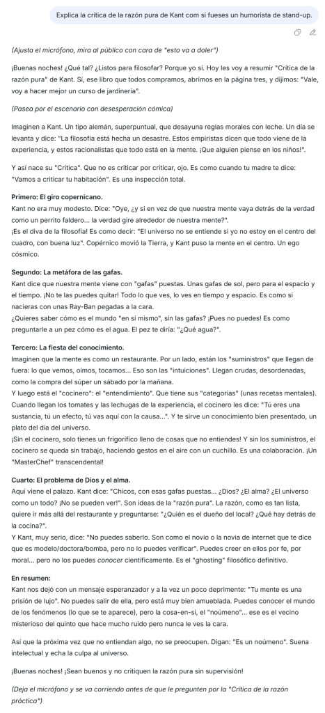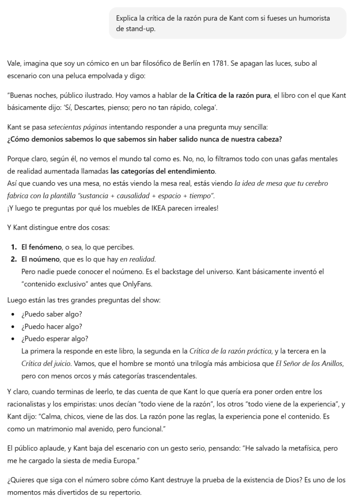 - “Explica la Crítica de la razón pura de Kant como si fueras un humorista de stand-up.”