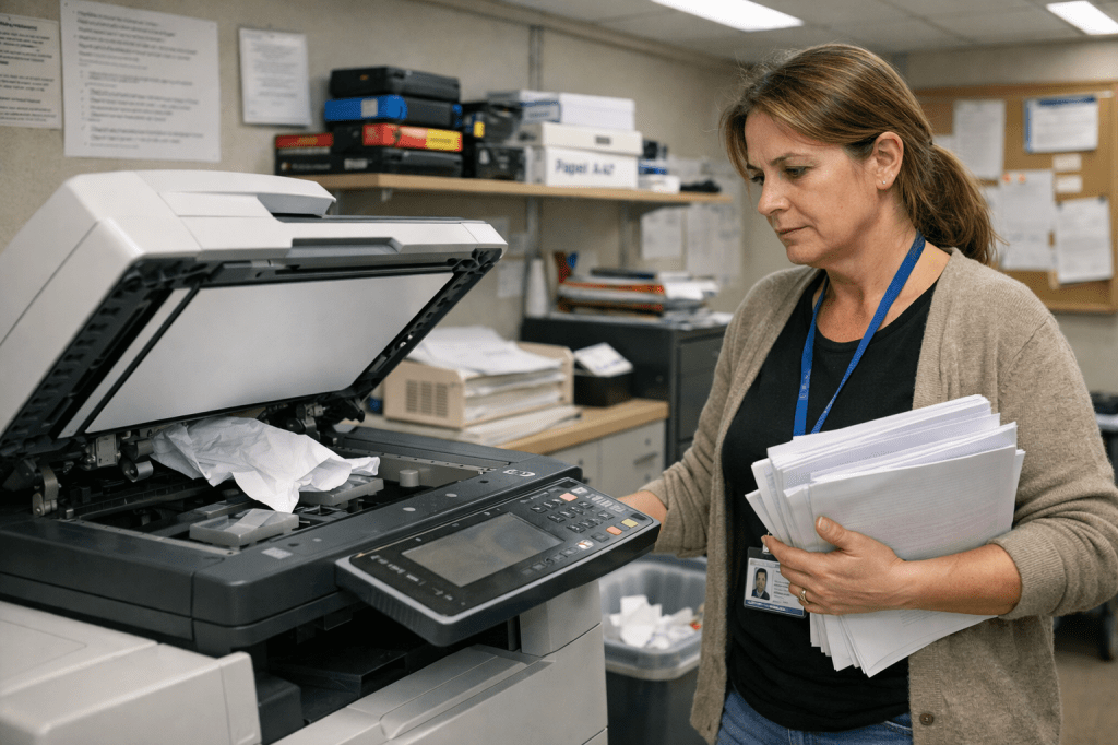 Para completar el panteón, está la fotocopiadora. Sí. La fotocopiadora es una figura maternal y vengativa. Cuando la tratas bien, te da hojas alineadas y sin rayas. Cuando tienes prisa, decide comerse el papel con la misma dignidad con la que un dragón devora a un caballero. Ha condicionado más unidades didácticas que cualquier reforma educativa.