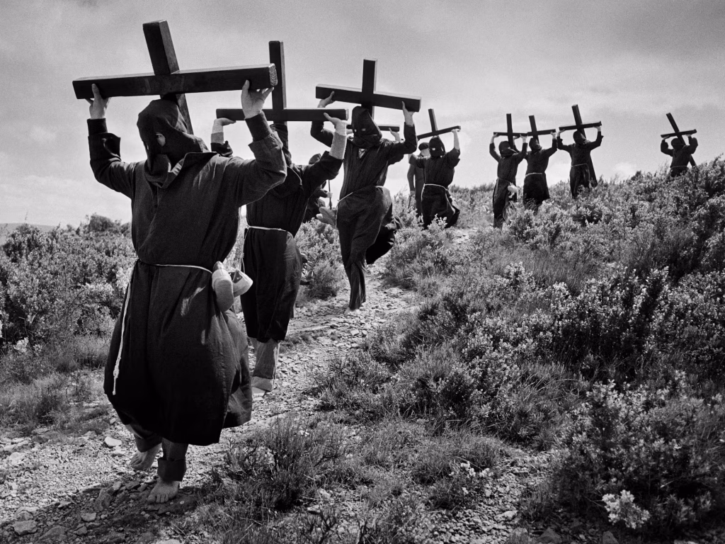 Hay lana, cera, sudor, mala luz, zapatos negros, niños que ya parecen haber entendido demasiadas cosas, viejas con caras como mapas plegados, hombres que cargan santos como si transportaran muebles para el más allá. Hay procesiones, máscaras, cuerpos, animales, curas, plañideras, bailarines, aldeanos, tullidos, novias, cadáveres, chavales que miran demasiado fuerte y rostros que parecen esperar la cámara desde el Concilio de Trento.